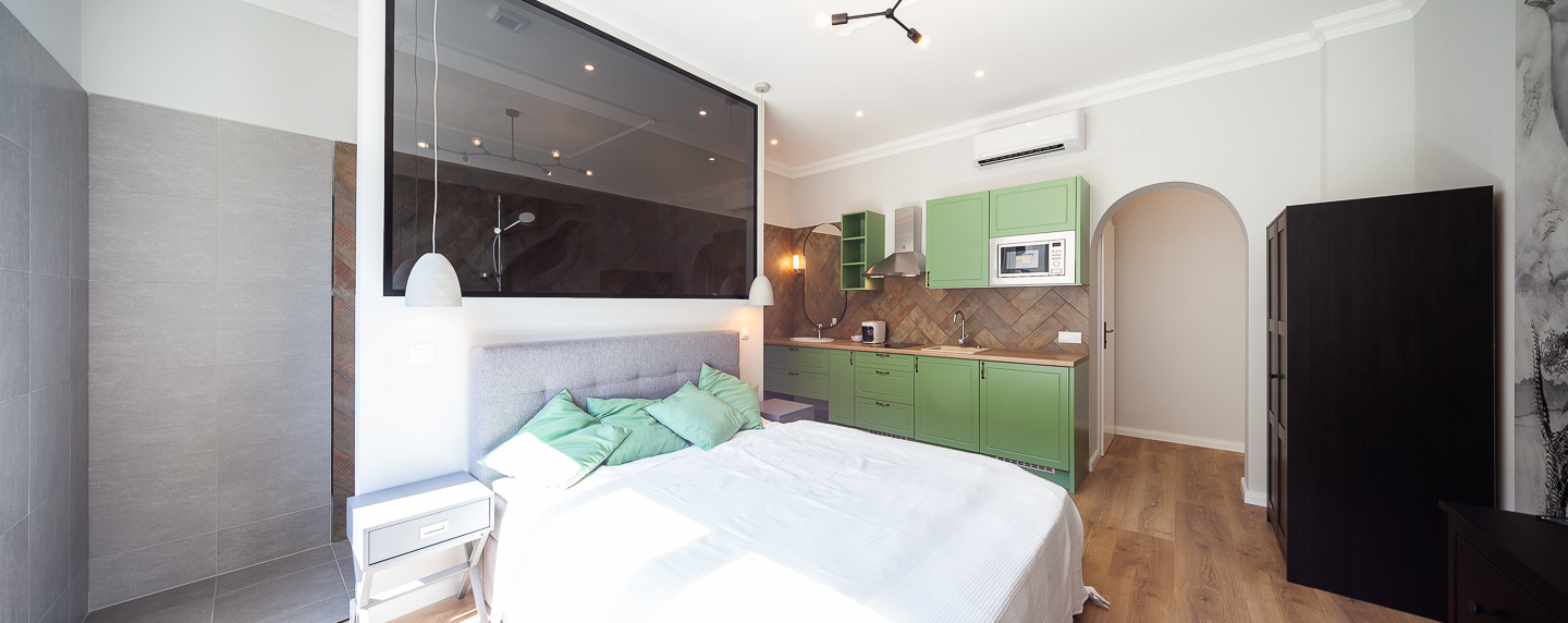 A “Kék” apartmant tágas kialakításának köszönhetően akár hosszabb tartózkodásra is bátran ajánljuk.